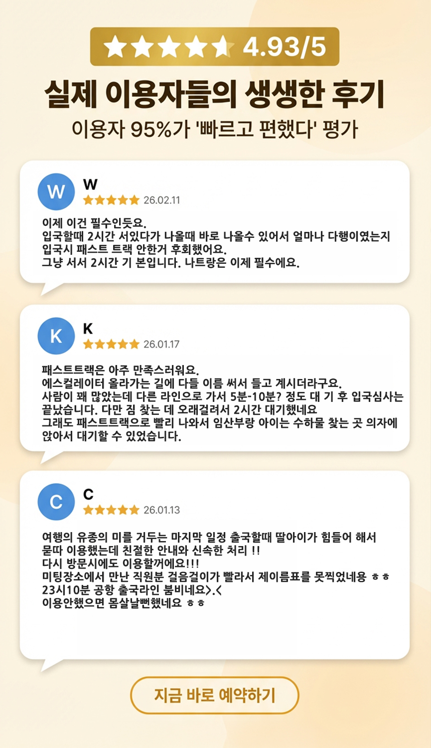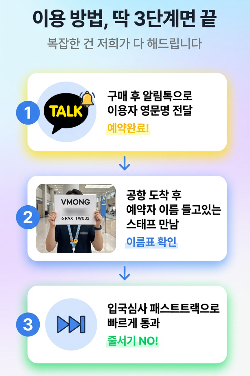 이 서비스는 복잡하고 시간이 오래 걸리는 출입국 절차를 VIP 전용 라인에서 전담 직원의 에스코트를 받으며 빠르게 통과할 수 있도록 도와드립니다