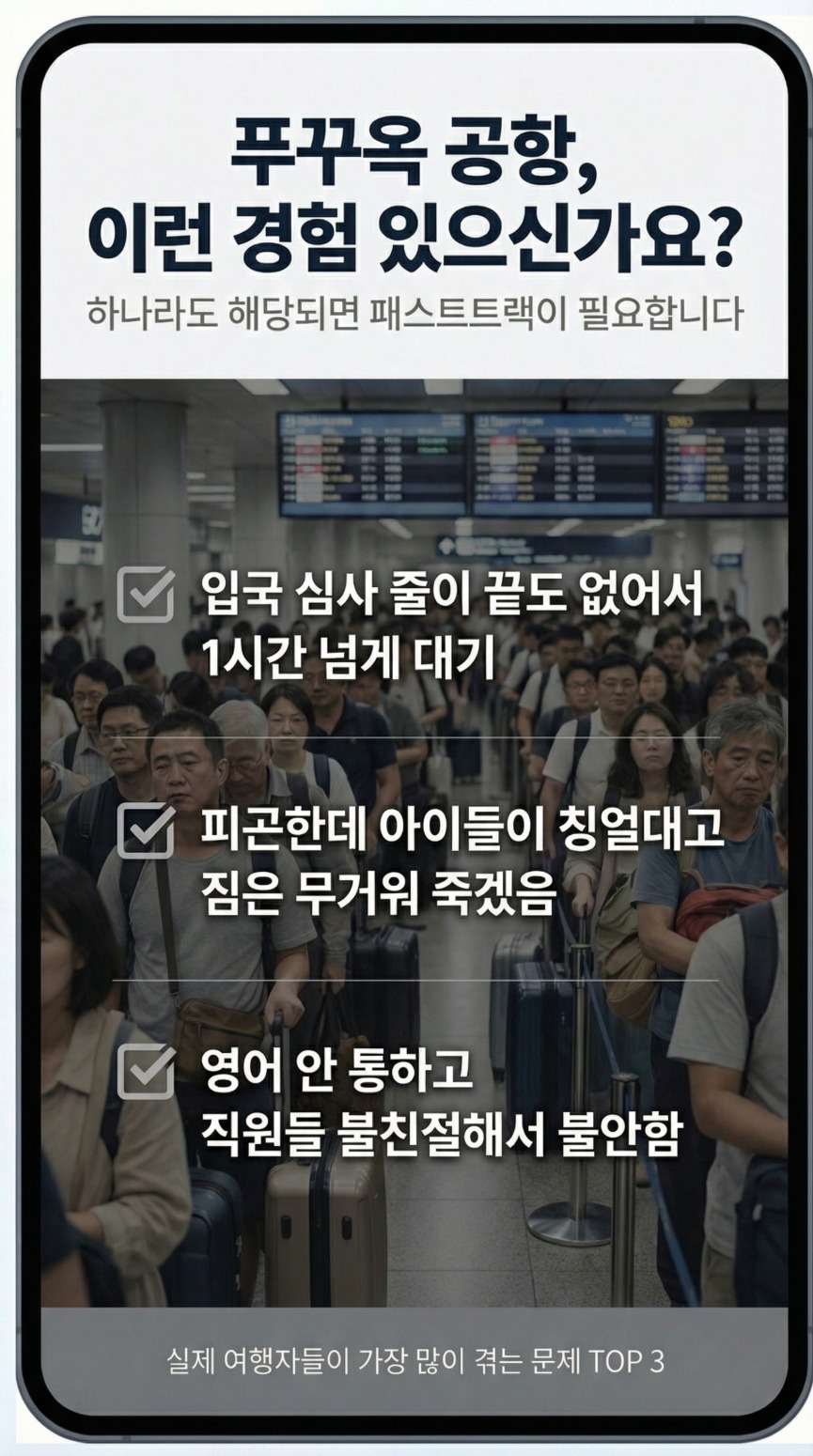 푸꾸옥 국제공항 출입국장에서 불필요한 대기 시간으로 지치지 마세요! 패스트트랙 서비스로 스마트하고 쾌적하게 여행을 시작하세요