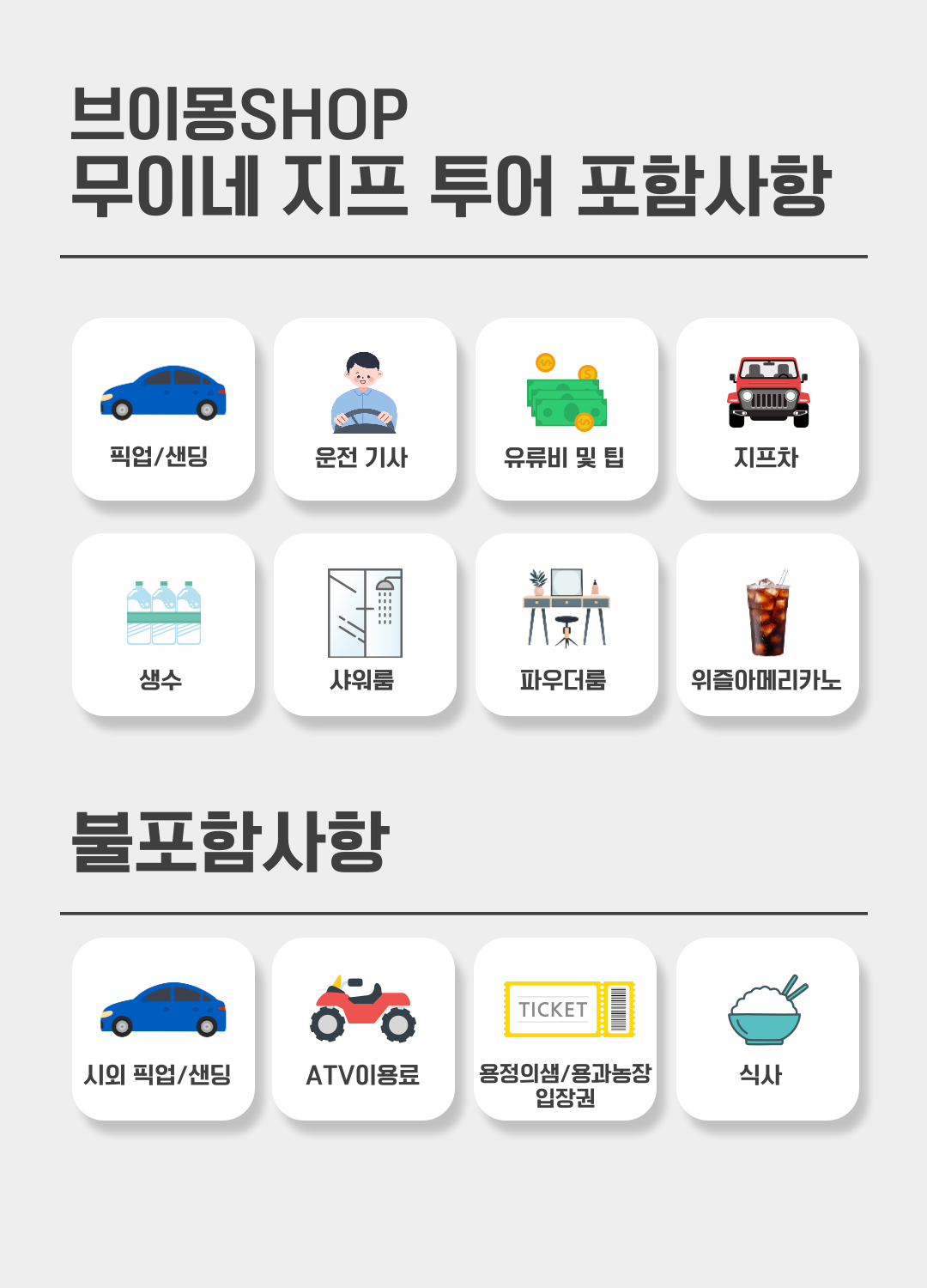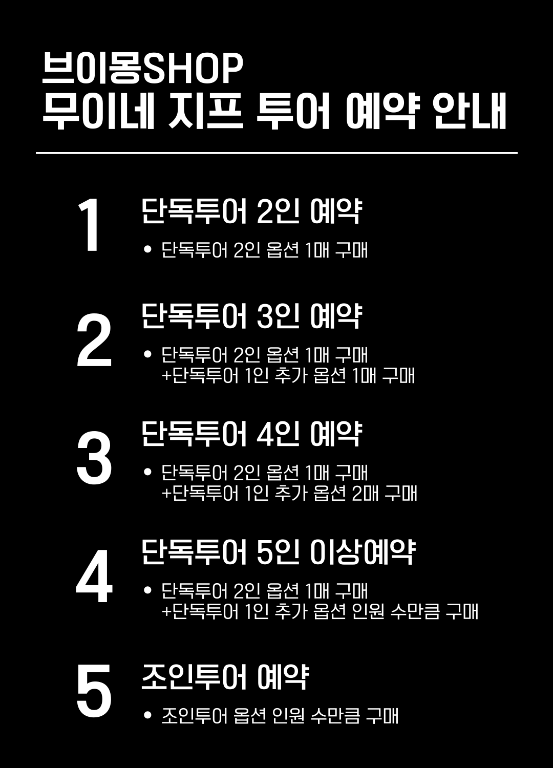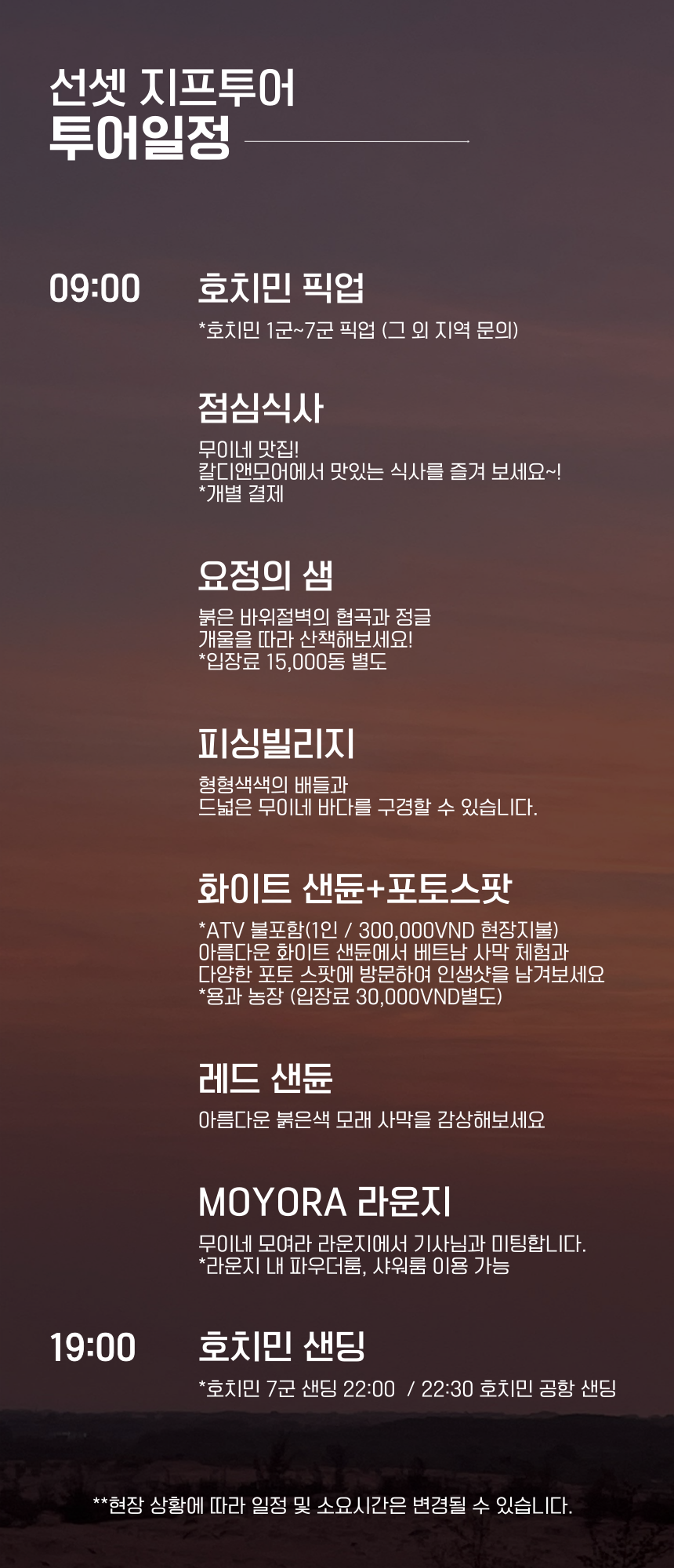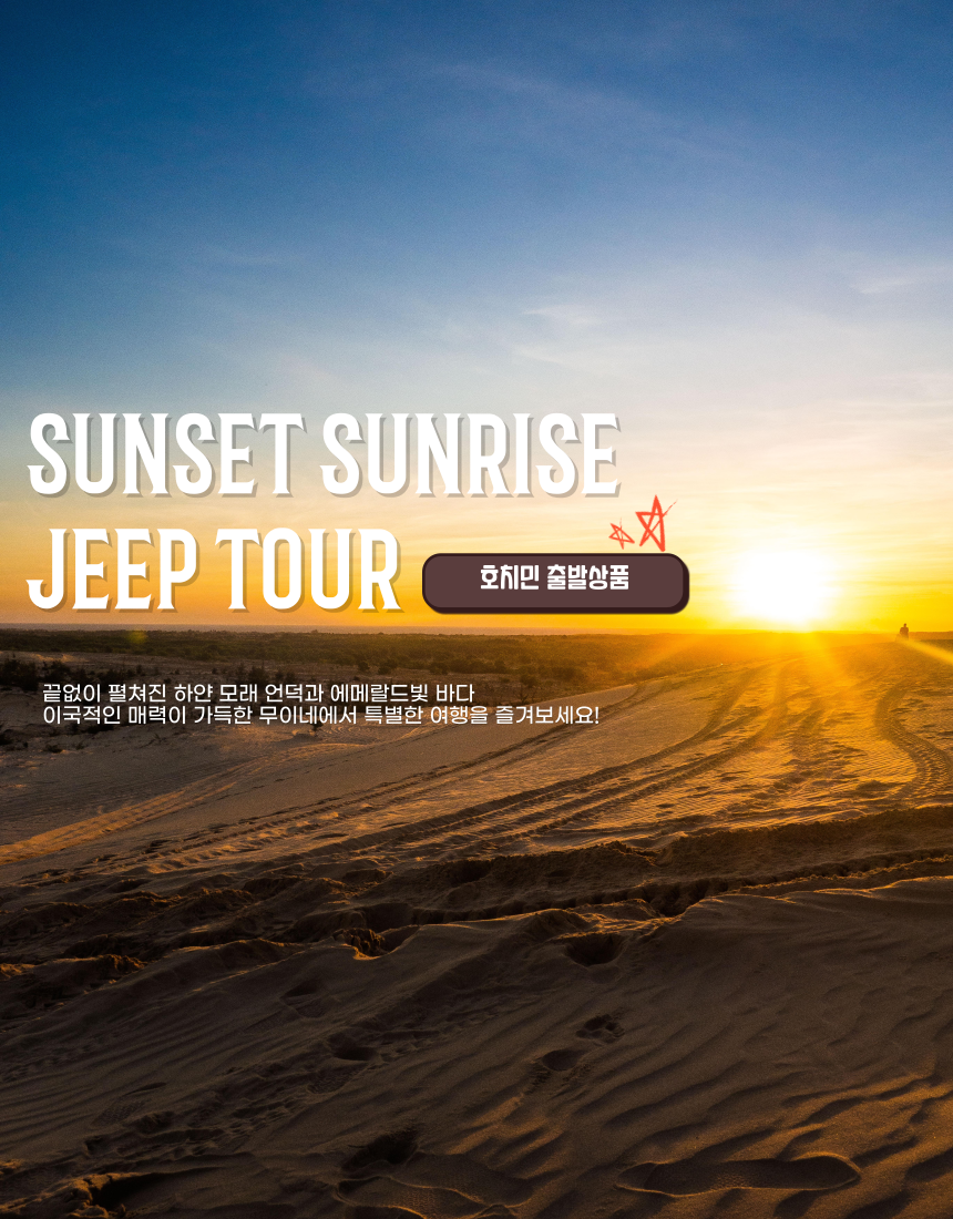 🌄 무이네 일출 지프투어 – 호치민에서 떠나는 사막 감성 여행 호치민 근교 최고의 명소, 무이네 사막에서 맞이하는 장엄한 일출! 화이트샌듄에서 새벽 공기를 가르며 지프를 타고 달리는 순간, 눈앞에 펼쳐지는 끝없는 모래언덕과 붉게 물든 하늘은 평생 기억에 남을 인생샷을 선물합니다 🕐 투어 스케줄 (총 약 13시간) 01:00 ~ 13:00 픽업 → 화이트 샌듄(일출 포인트) - 용과밭- 포토스팟 - 레드샌듄(일몰 포인트) -피싱빌리지 -요정의샘 - 라운지(칼디앤모어) 저녁식사 or 정비 - 호치민 복귀 ✅ 포함사항 왕복 픽업/샌딩 서비스 (호치민 시내 1~7군 / 이외 지역은 추가요금 발생) 무이네 지프차량 투어 (단독 / 조인 선택) 위즐아메리카노 라운지/파우더룸 이용 ❌ 불포함사항 화이트샌듄 ATV 탑승료 식사 비용 용과밭 입장료 시외지역 픽업/샌딩 추가비용 ※ 현지 상황에 따라 일정과 순서는 변경될 수 있습니다.