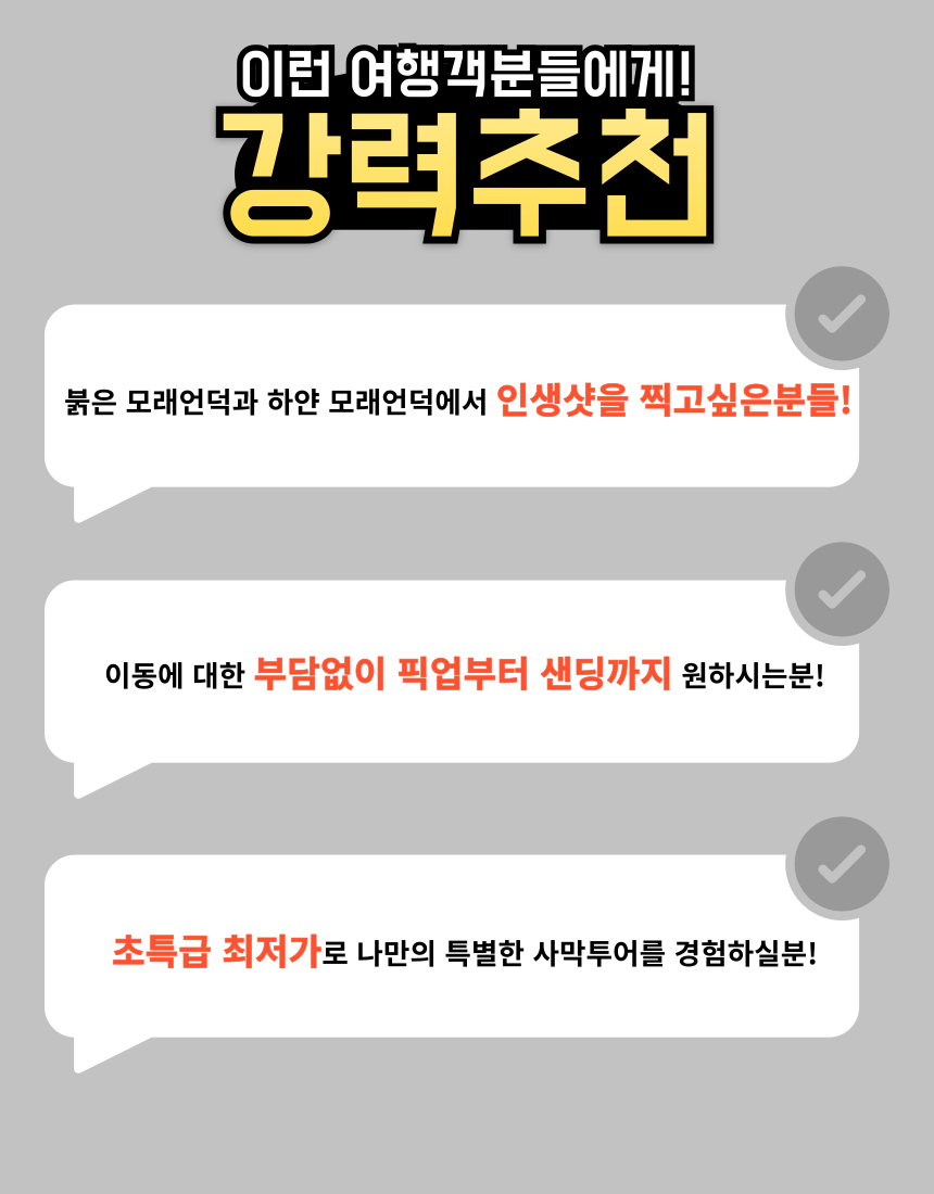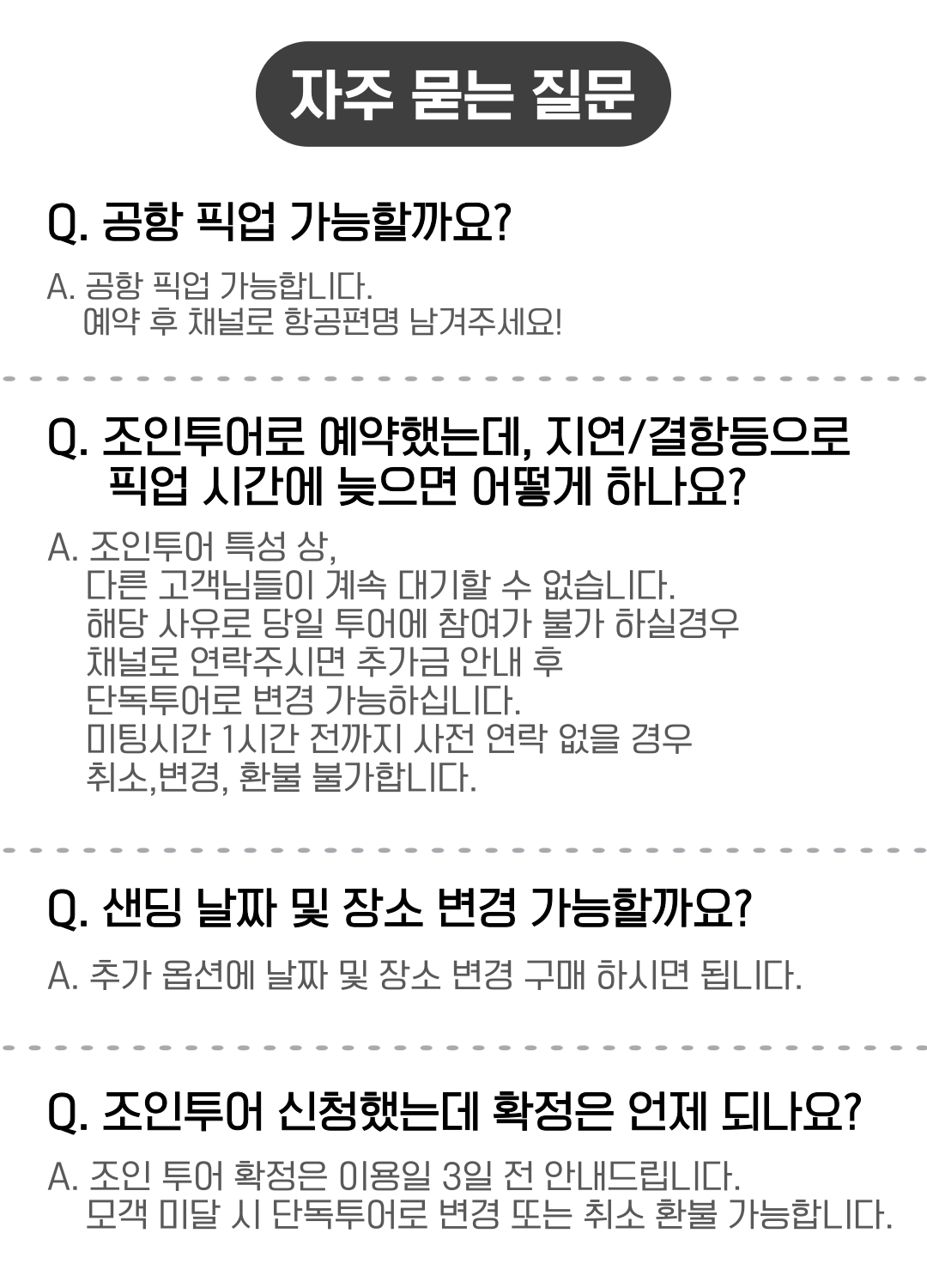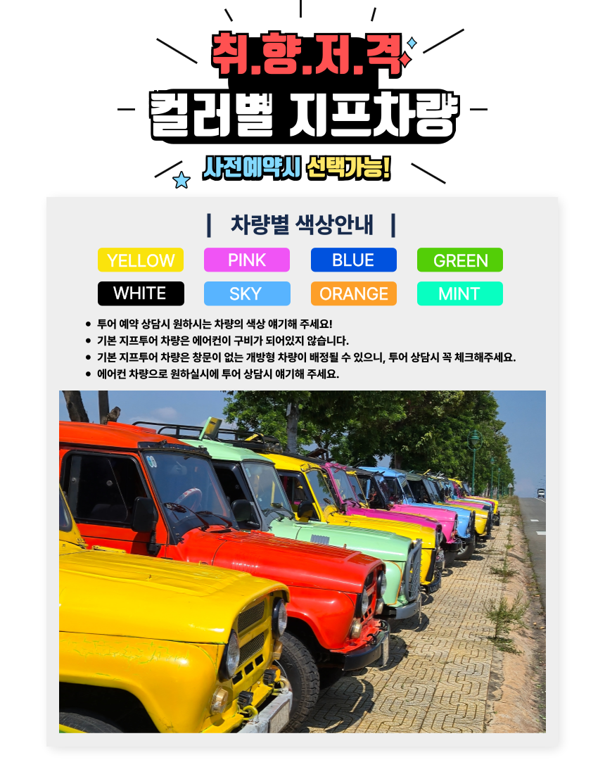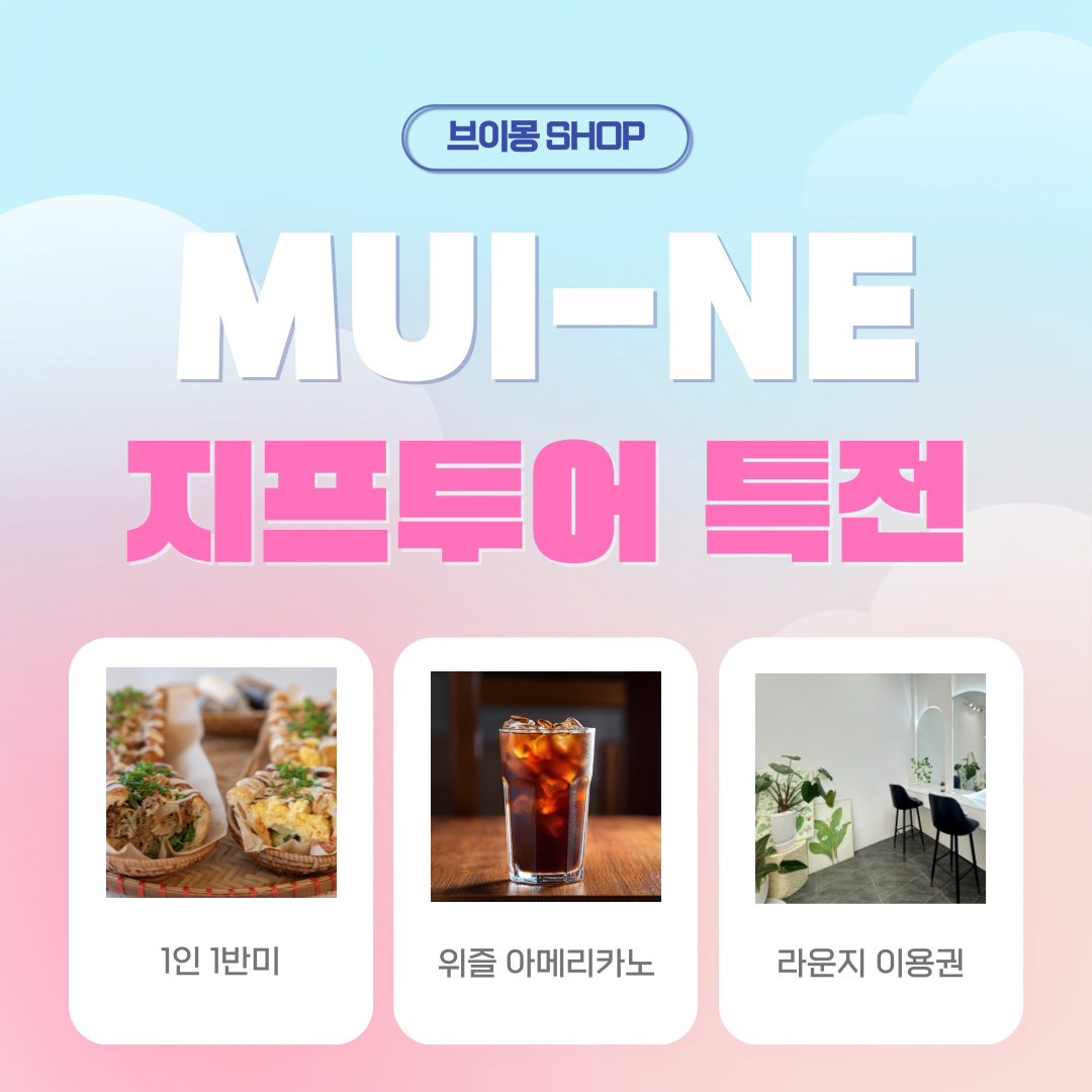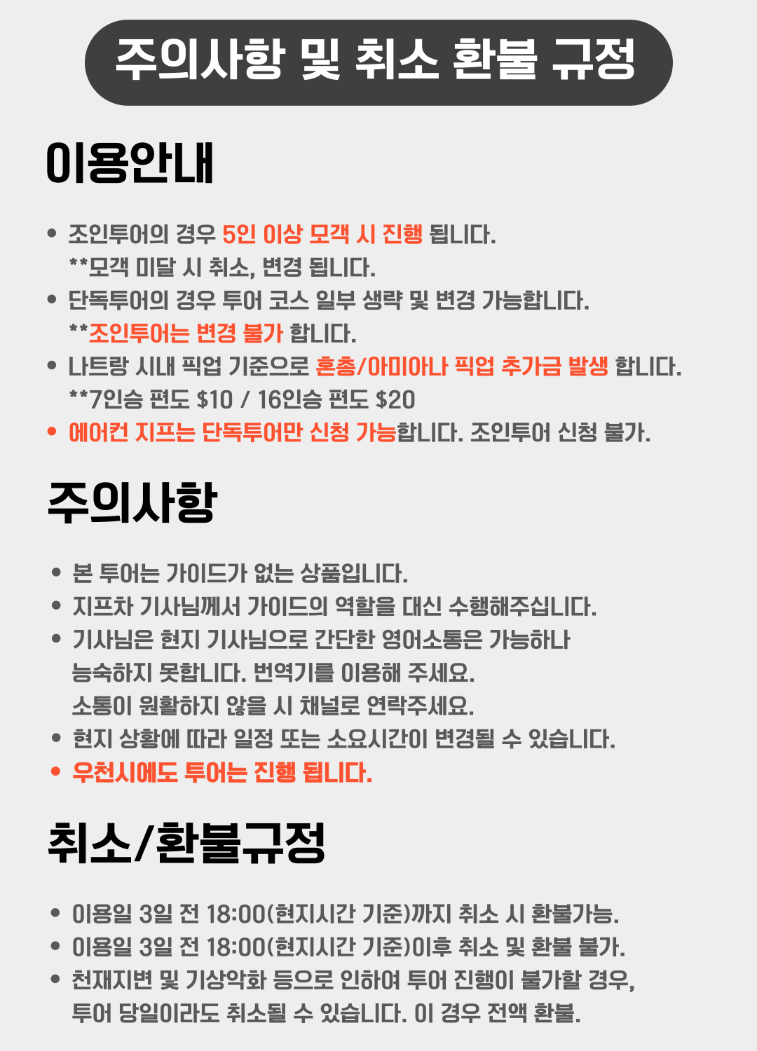 🌄 무이네 일출 지프투어 – 호치민에서 떠나는 사막 감성 여행 호치민 근교 최고의 명소, 무이네 사막에서 맞이하는 장엄한 일출! 화이트샌듄에서 새벽 공기를 가르며 지프를 타고 달리는 순간, 눈앞에 펼쳐지는 끝없는 모래언덕과 붉게 물든 하늘은 평생 기억에 남을 인생샷을 선물합니다 🕐 투어 스케줄 (총 약 13시간) 01:00 ~ 13:00 픽업 → 화이트 샌듄(일출 포인트) - 용과밭- 포토스팟 - 레드샌듄(일몰 포인트) -피싱빌리지 -요정의샘 - 라운지(칼디앤모어) 저녁식사 or 정비 - 호치민 복귀 ✅ 포함사항 왕복 픽업/샌딩 서비스 (호치민 시내 1~7군 / 이외 지역은 추가요금 발생) 무이네 지프차량 투어 (단독 / 조인 선택) 위즐아메리카노 라운지/파우더룸 이용 ❌ 불포함사항 화이트샌듄 ATV 탑승료 식사 비용 용과밭 입장료 시외지역 픽업/샌딩 추가비용 ※ 현지 상황에 따라 일정과 순서는 변경될 수 있습니다.