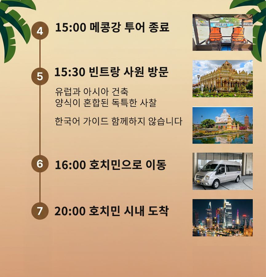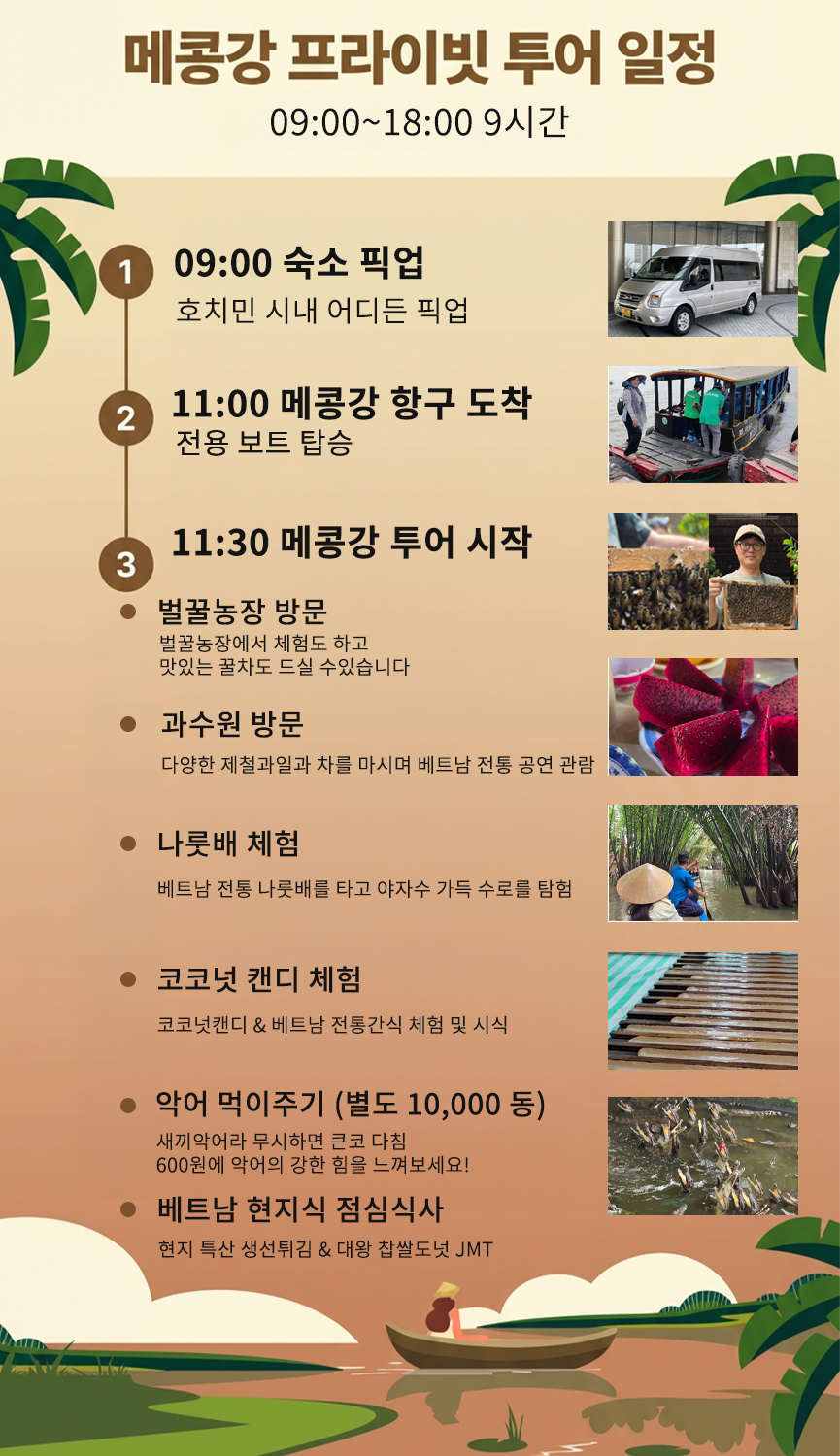현지 과수원에 들러 망고, 람부탄, 용과 등 제철 열대 과일을 맛보고, 남부 베트남 전통 민요 공연도 감상합니다.